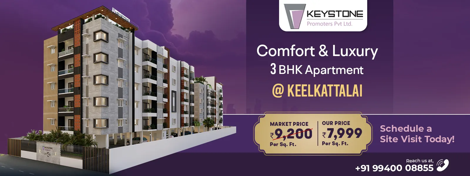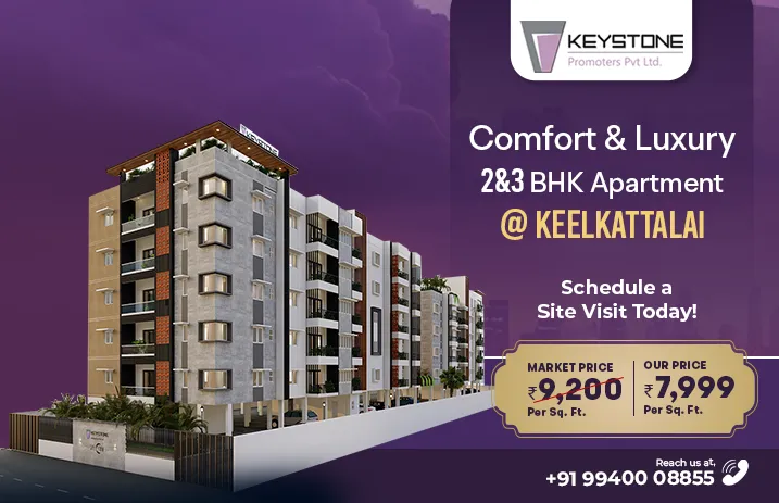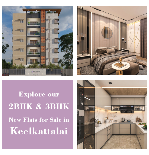 Dream to own a house isn’t a passing cloud, it’s a commitment. To witness the true meaning of grandeur, step into our exclusive array of apartments formed in Keelkattalai for people who look for a comfy stay at affordable price. Keystone Promoters takes the pride to launch a line of flats for sale in Keelkattalai clubbed with opulence, comfort and elegance. Explore our 3BHK new flats for sale near Velachery and make it your own at the earliest.